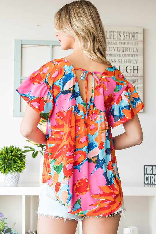 Floral Smocked Ruffle Shoulder Tie Neck Top